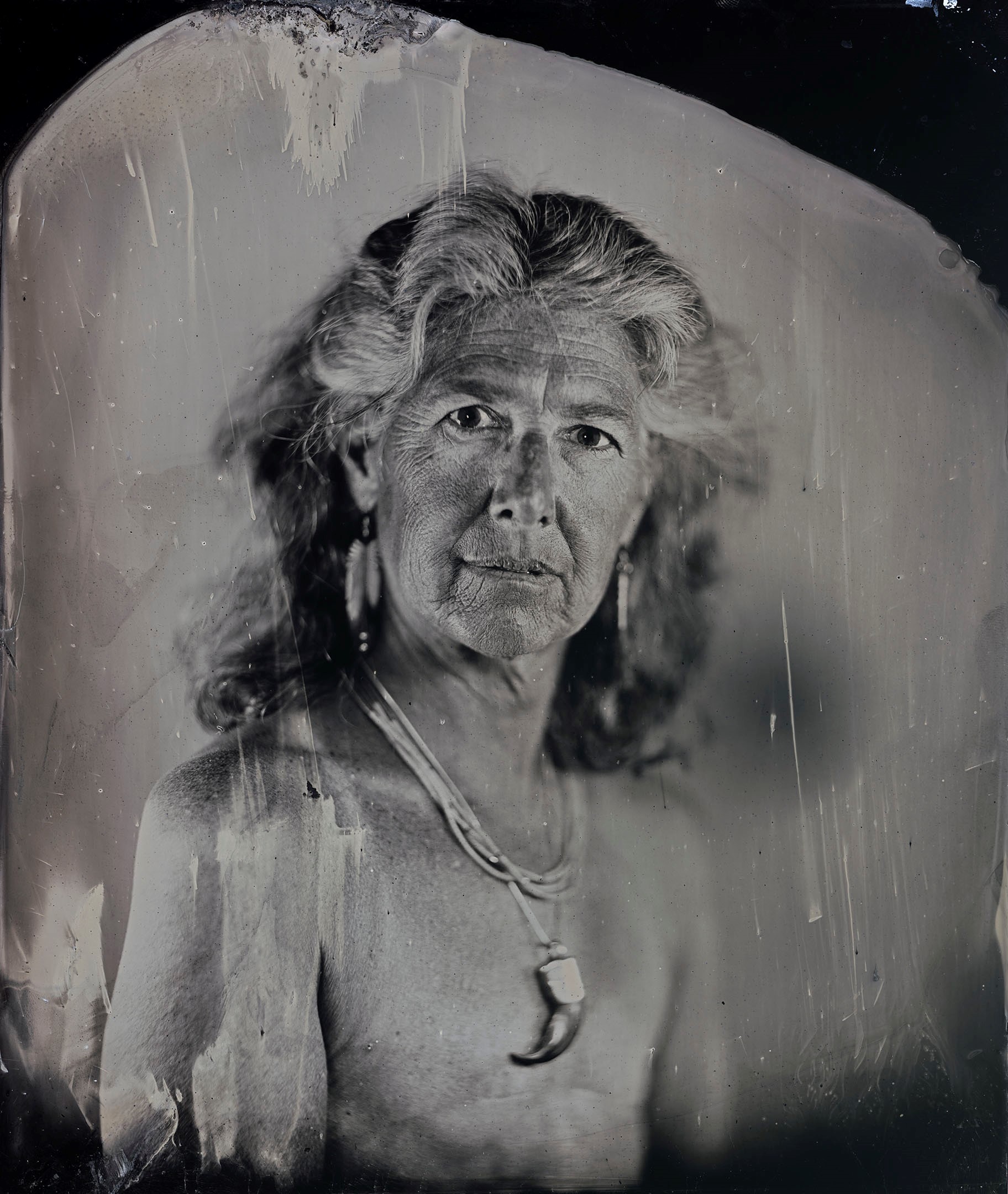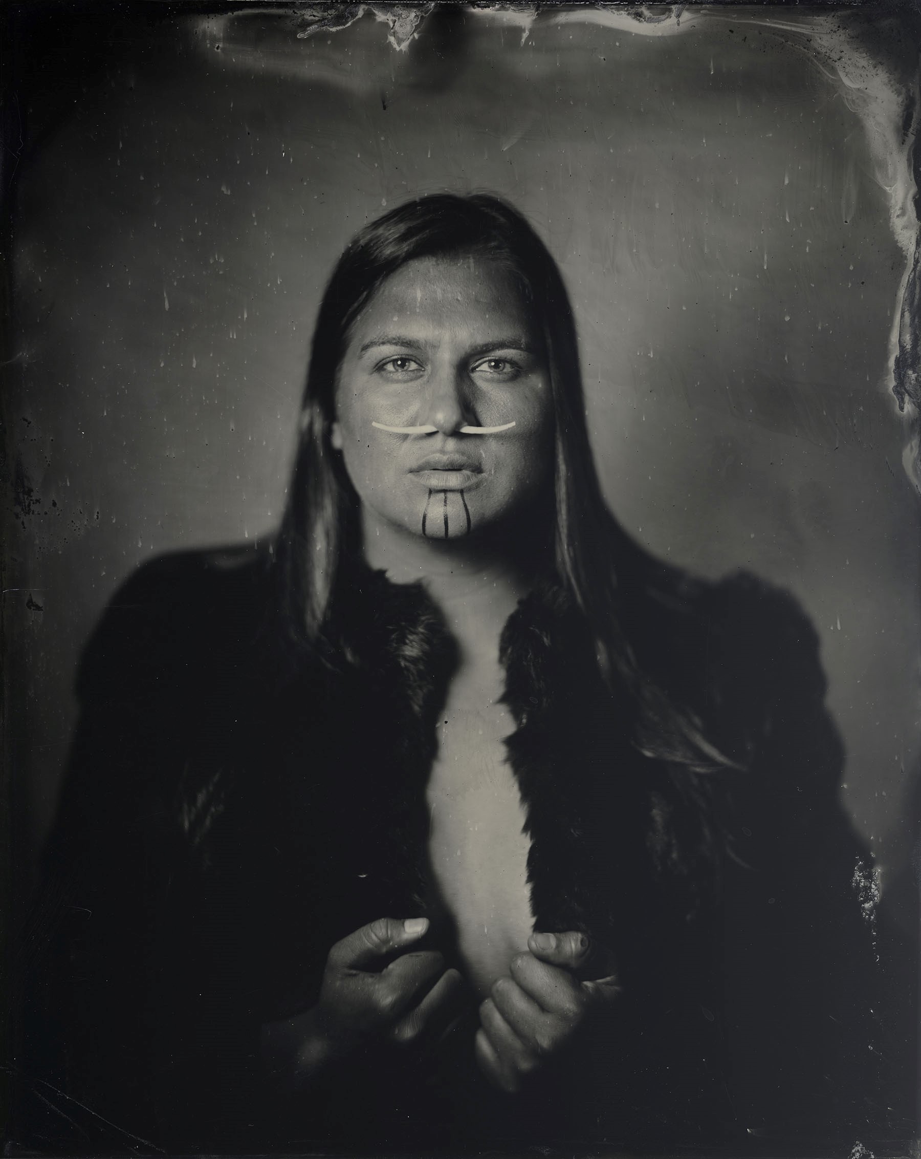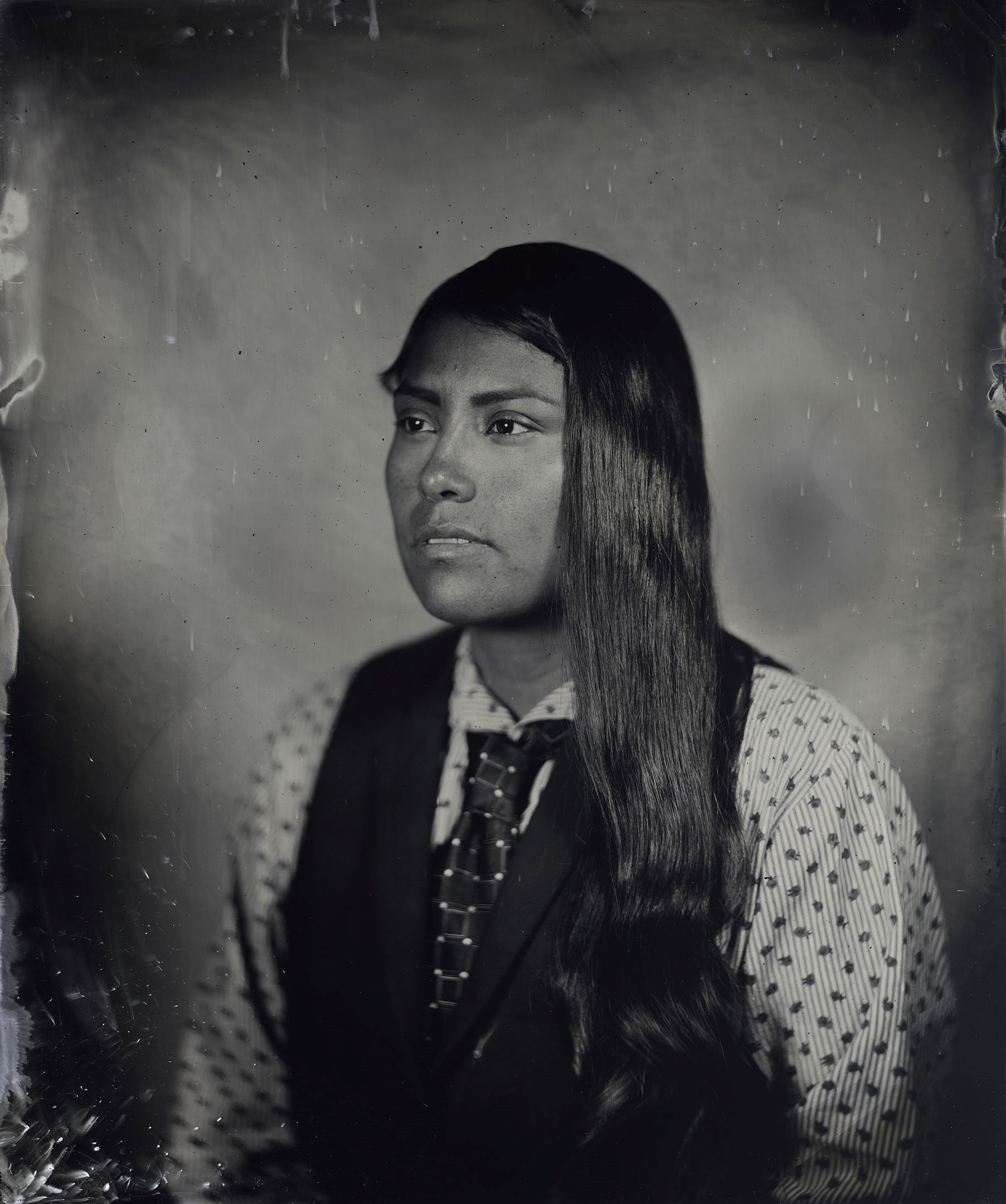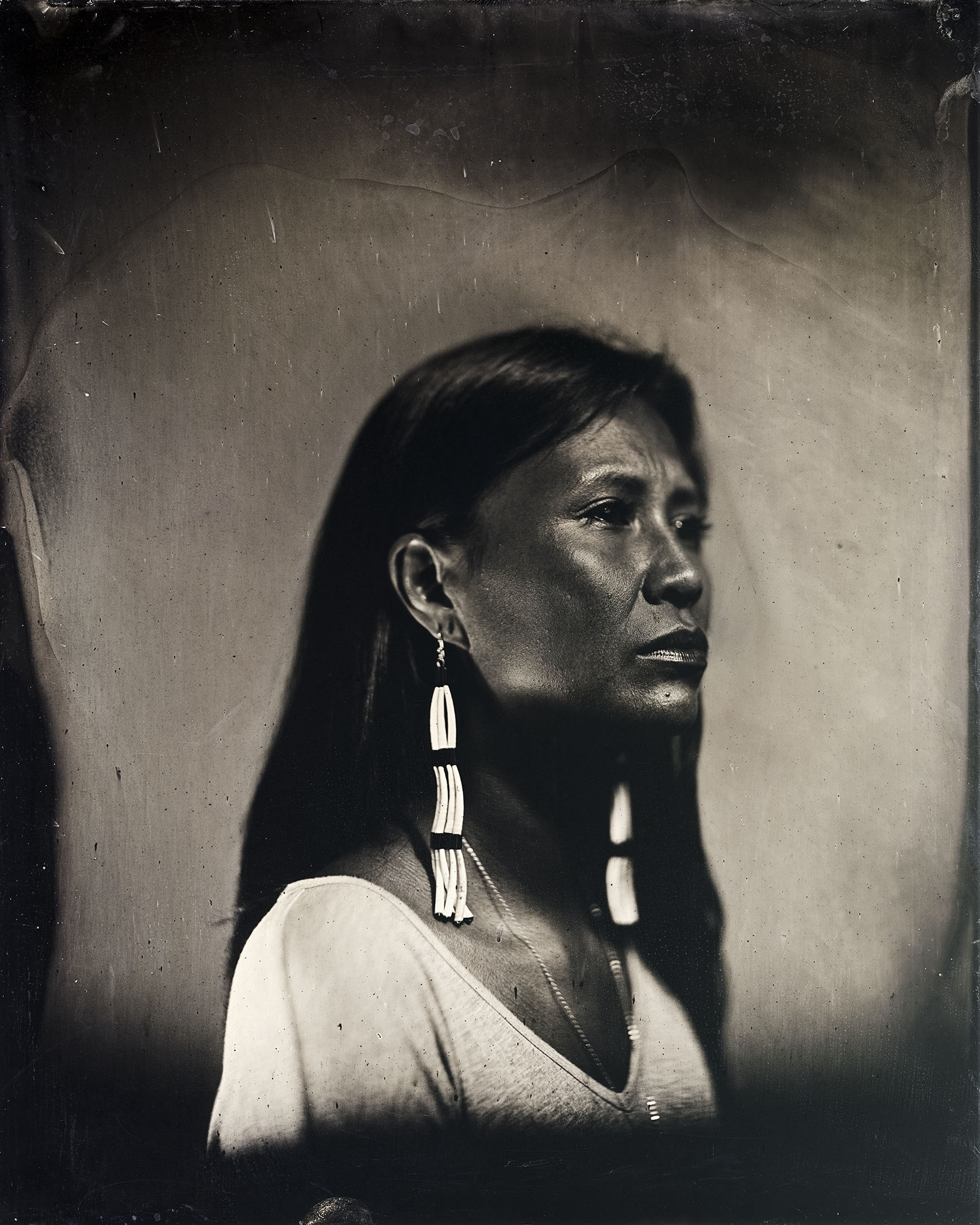 Many of our relatives were and continue to be inappropriately photographed and misrepresented. I am working to redress this from behind and in front of the lens by creating images of contemporary indigenous people from an indigenous perspective. Through the timeless lens of the tintype, and in collaboration with my subjects, the relationship between the process of creation and the person being photographed is made manifest.