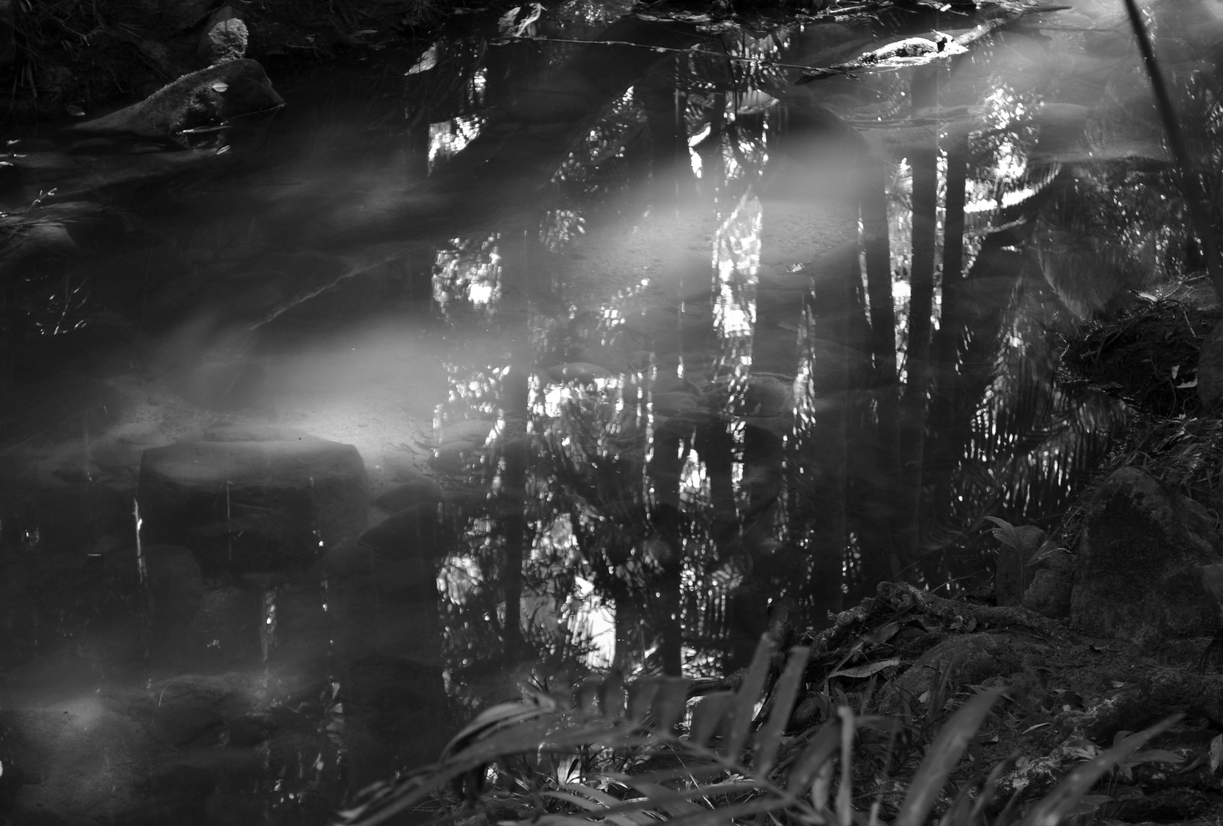 It moves noiselessly into place. So much so, I am tricked to think it’s a mere play of light. Yet, it glides above its silent witnesses, who have been companions for time immeasurable. Its fingers point, but the gentle trickle of water leads it away further down the stream. I feel it imploring me, but by the time I see its face peering from the shadows, in the gloom of the rainforest, the sun has moved on and it fades as it appeared, without sound.